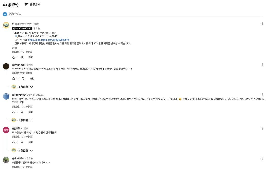 Kyle在视频描述和置顶评论中直接放置了购买链接与优惠码,将内容流量精准导入销售渠道。评论区活跃的讨论进一步形成了口碑传播的二次发酵。