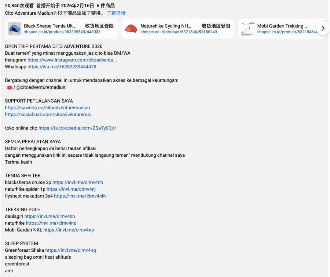 Mobi的合作策略很直接:把产品交给出镜的探险者,在真实登山场景中自然植入。视频中,帐篷等装备出现在实际露营环境中,频道在描述区与商品橱窗直接挂出Shopee购买链接,并标注“所有装备均为实际使用”。