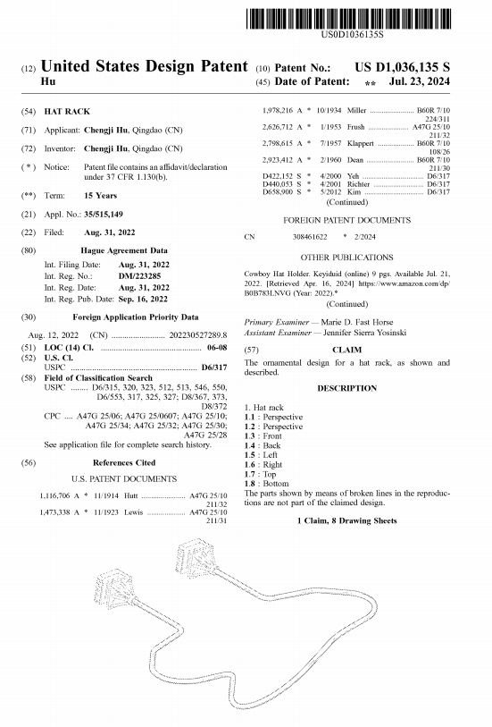 原告HU, CHENGJI是中国人,此次维权的是一款牛仔帽架。这款车坐椅帽架,以便在您驾驶时将您的帽子牢固地固定在位。它旨在防止您的牛仔帽被压碎或变形。而且支架涂有橡胶漆,触感光滑且无毛刺,因此您不必担心它会损坏您的帽子。