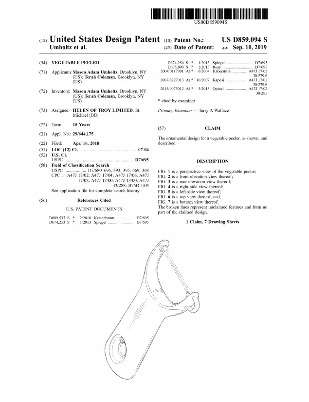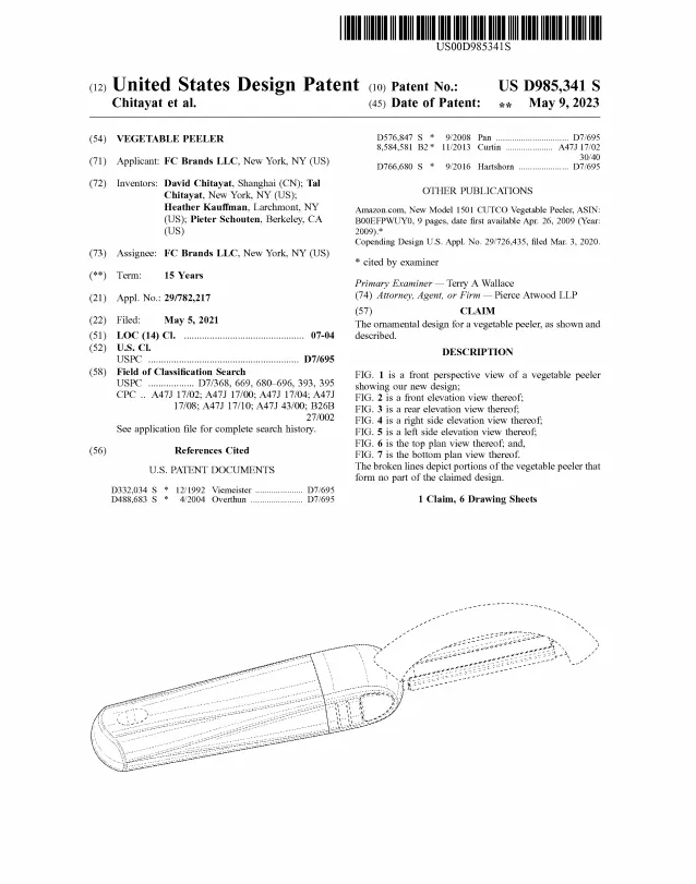 此外,还有两款新近授权的削皮器外观专利值得关注:USD1012630S(2022年1月27日申请,2024年1月30日授权)和USD1068412S(2023年2月28日申请,2025年4月1日授权)。这些专利目前均处于有效状态,相关卖家需仔细排查自家产品是否落入其保护范围。