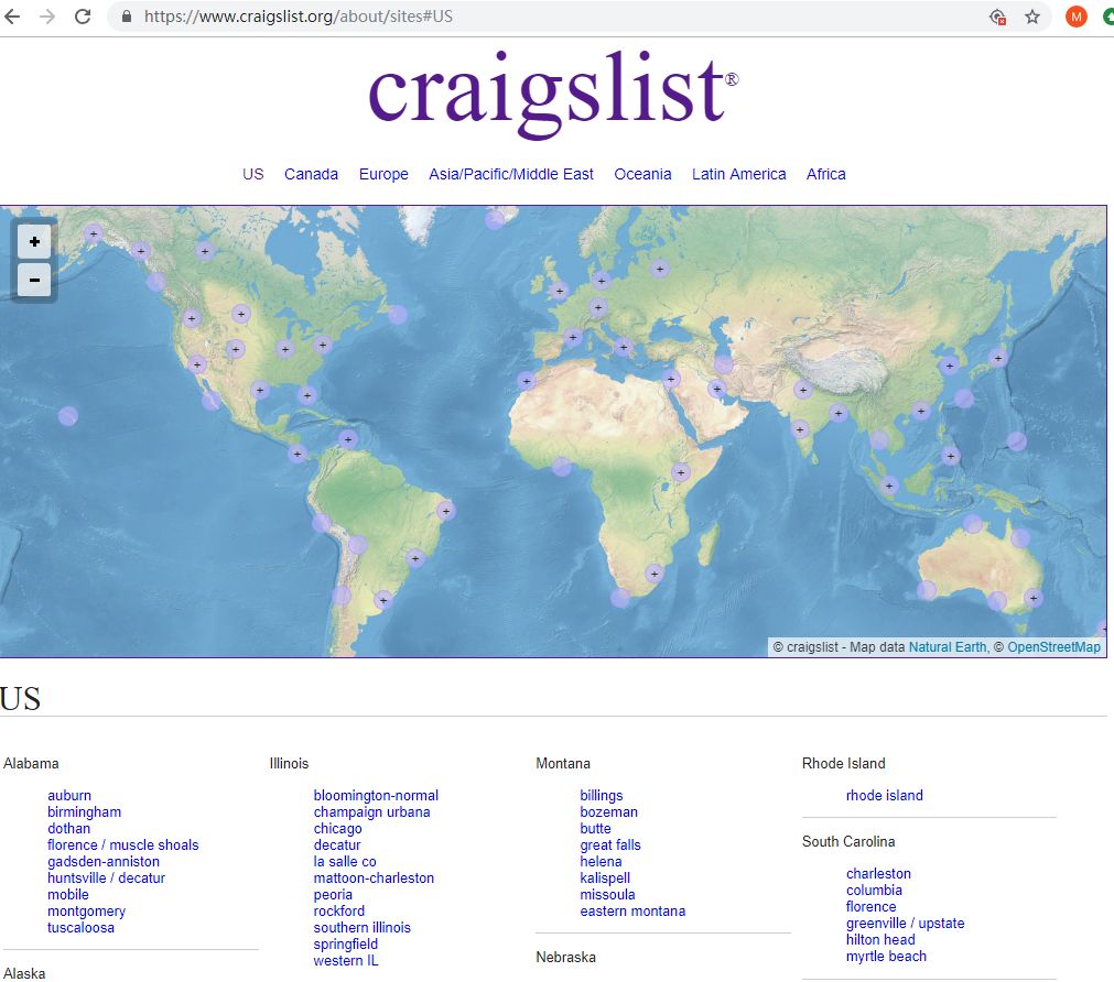3、该网站按国家、州、地区分类,产品listing来自各个国家,从美国到非洲。点击特定的州或地区,商家可以在“For Sale”和“Services”板块发布要销售的产品;