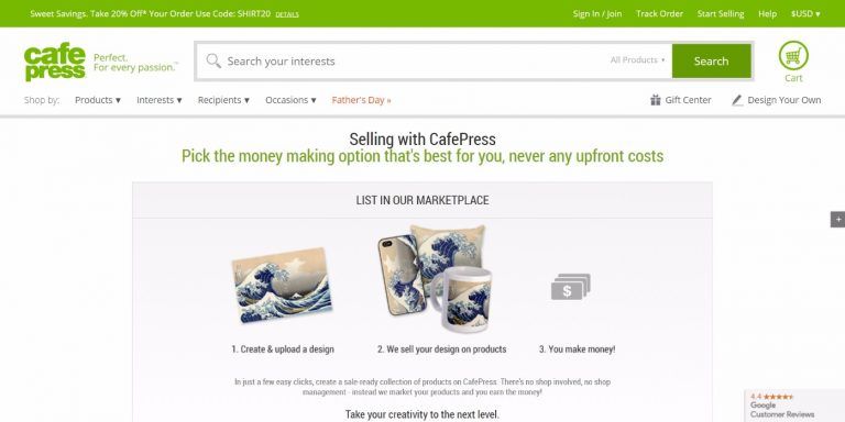 CaféPress不收取开店费用,前期无需投入费用,刊登产品也不收取额外费用;