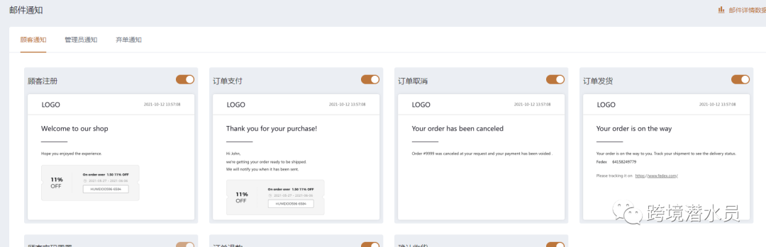 邮件通知都这个模块设置,弃单可设置三个阶段,可自行选择是否开启,默认开启一个阶段。