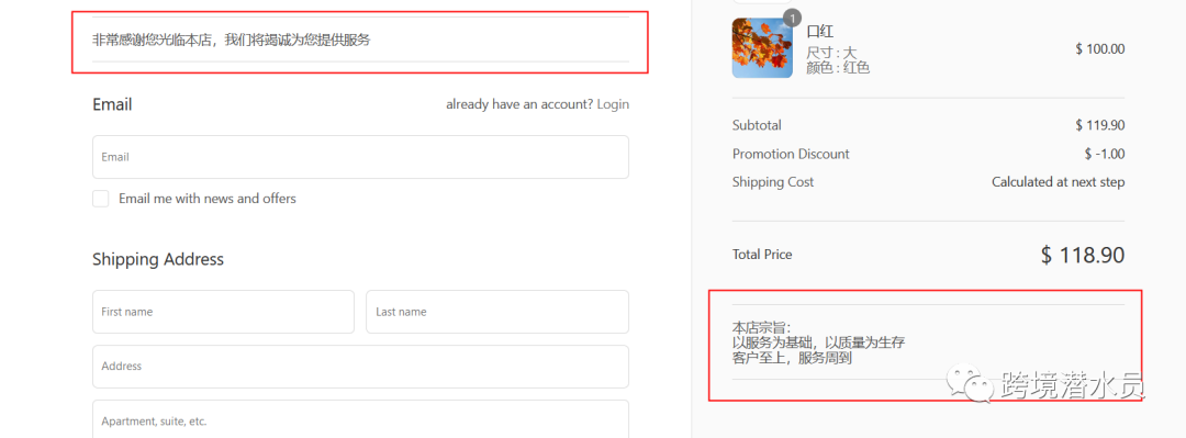 美化您的结账页,作用于结账页的顶部和尾部;可以设置Banner、店铺Logo、补充说明等,促进客户了解更多的购买信息,提升品牌建设。