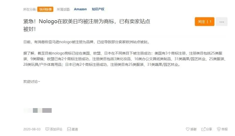前不久,无品牌卖家上传listing时常用的nologo也被注册为商标,无法使用了。此外,卖家们纷纷反映在填写N/A、N/B时会转化为nologo,导致侵权。