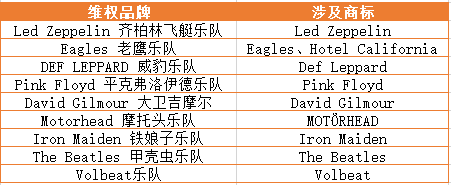 以下表格中统计了部分欧美乐队曾发起的品牌维权案,供各位卖家参考: