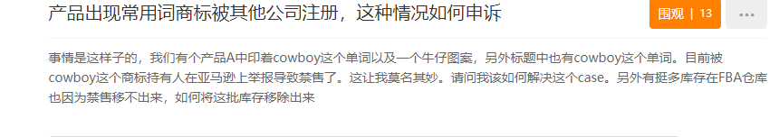 近来亚马逊的恶意竞争现象越来越严重,不少卖家会在竞争对手的产品关键词上动手脚,将某些常用的词汇注册为商标,以此打击竞争对手,如下图中的cowboy。