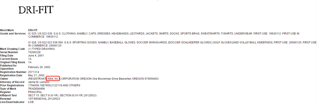 耐克还曾因商标Dri-Fit维过权: