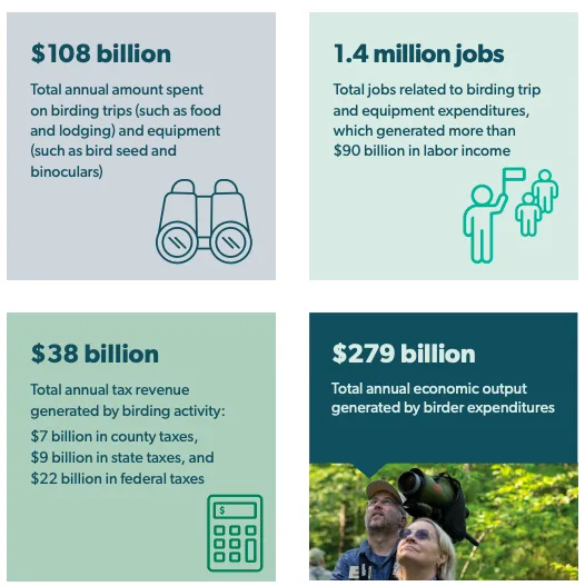 在美国,观鸟是一项全民运动。根据美国鸟类学会的最新数据,美国观鸟爱好者数量已接近1亿人,约占成年人口的三分之一,每年在相关支出上的总额高达1080亿美元。