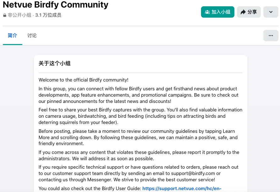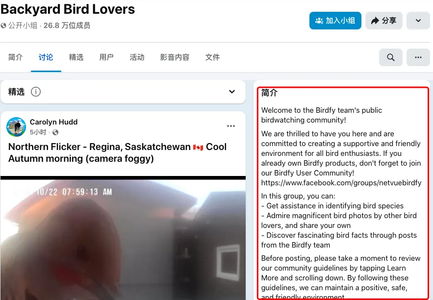 Birdfy在Facebook上共设立6个群组,其中最具代表性的“Backyard Bird Lovers”完全公开,聚集了高达26.8万名观鸟爱好者,甚至超过了品牌主页粉丝数量。