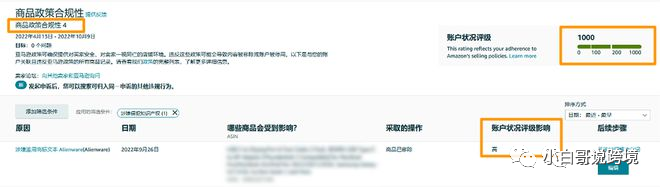 除原有的彩色标识之外,亚马逊会以0到1000的数字来显示账户评级的分数,让卖家更方便的了解自己账户评级的距离与各种阈值的差值,而且也方便了卖家优先查看和处理严重影响账户状况的违规行为。