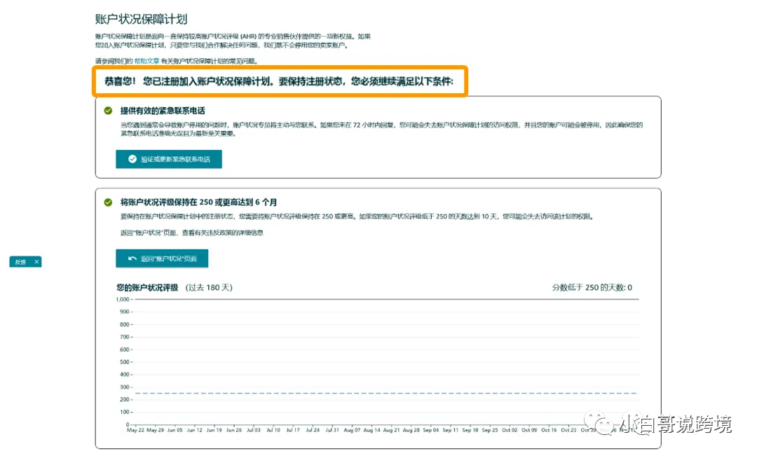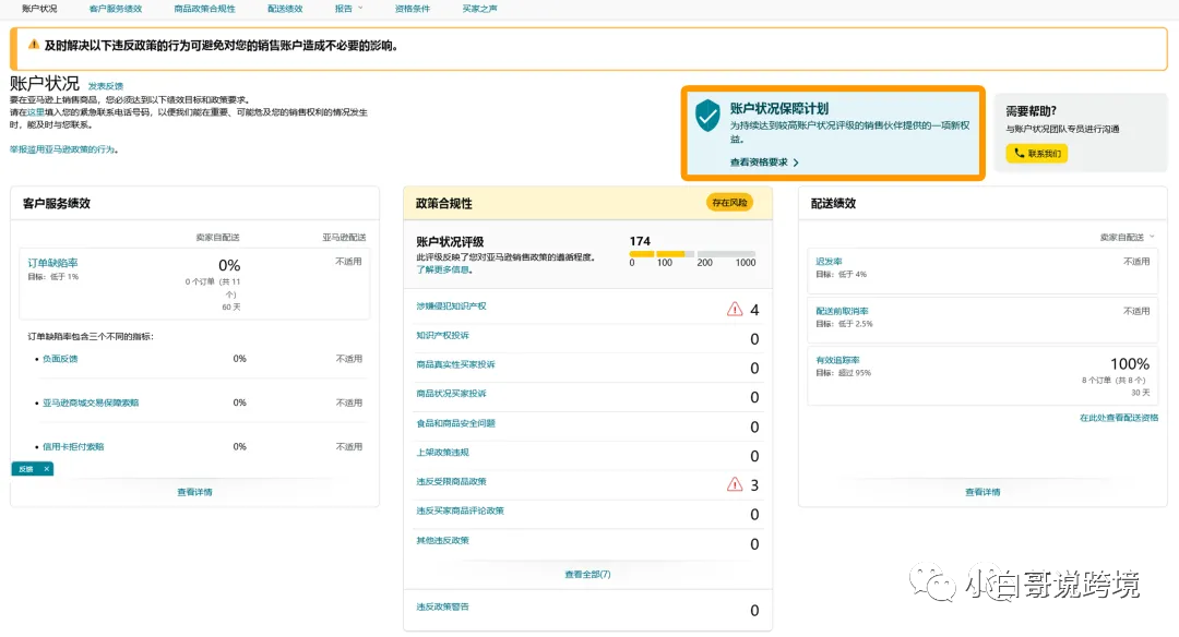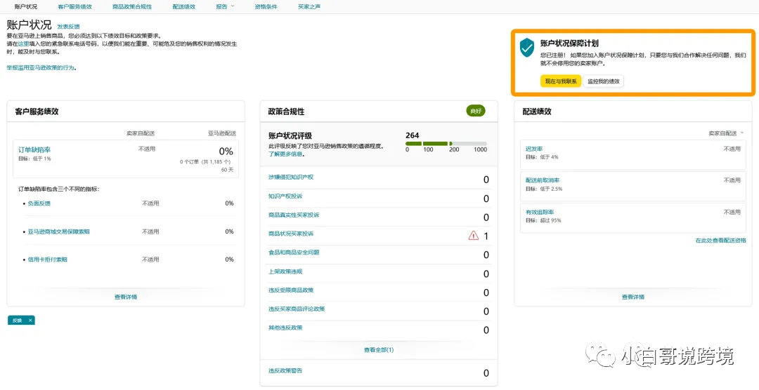 买可以登录亚马逊卖家平台,点击“绩效” > “账户状况”,根据“账户状况”页面右上方的“账户状况保障计划”提示框,判断当前是否已加入账户状况保障(AHA)计划。