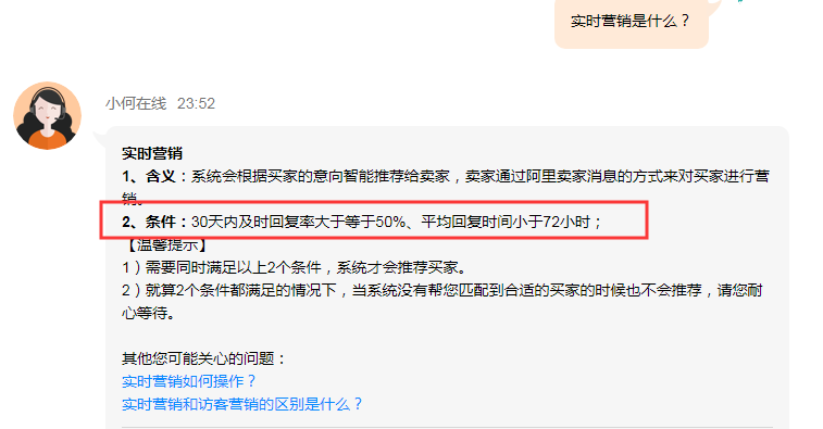 新增 营销商品商机转化率。此指标代表近30日内商家店铺内进行过营销的商品的商机转化率,具体指近30天内访问过这些商品详情页的买家中,在近30天内在本店内发生过询盘、TM咨询、下单的买家数占比。营销方式包含外贸直通车、顶级展位、客户通老客站内营销、客户通EDM营销、粉丝通营销等。