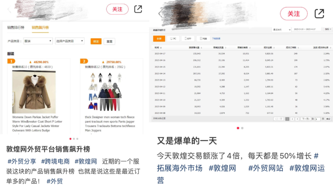 小红书也有人分享出成交量爆单的“喜报”,称敦煌网爆火之后交易额涨了4倍,每天都是50%的增长。