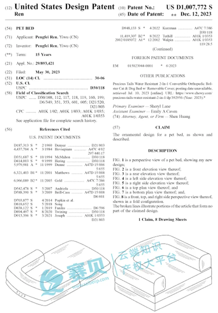 专利产品:人宠折叠床(具备可折叠、便于收纳、适用于宠物休息等核心特征,具体外观需以专利。原告Pengfei Ren主张,目前跨境电商平台上有多款在售人宠折叠床产品,其外观设计落入了自身持有的美国外观专利(专利号D1007772)的保护范围,涉嫌专利侵权。附图为准)赛贝提醒跨境卖家,未经授权不得擅自使用,以免引发侵权风险。
