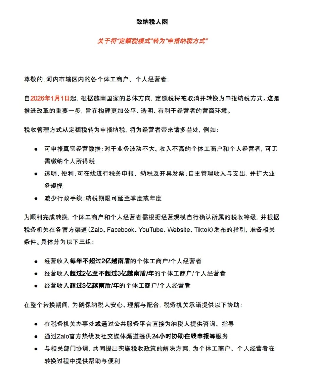 咨询渠道:税务机关在办事处、公共服务平台提供线下指导,同时通过 Zalo 热线、TikTok 账号提供 24 小时在线咨询,语言障碍卖家可委托当地财税代理协助。