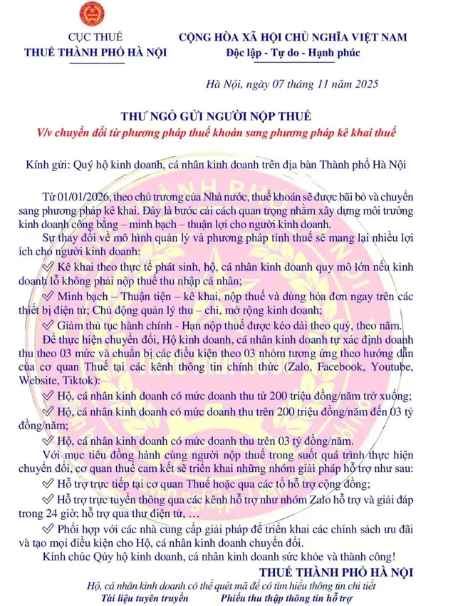 同时,自2026年1月1日起,根据越南党和国家相关政策,所有企业户及从事经营活动的个人(即“企业家庭”)将全面从现行的统一税制转为收入申报制,或选择转型为企业。