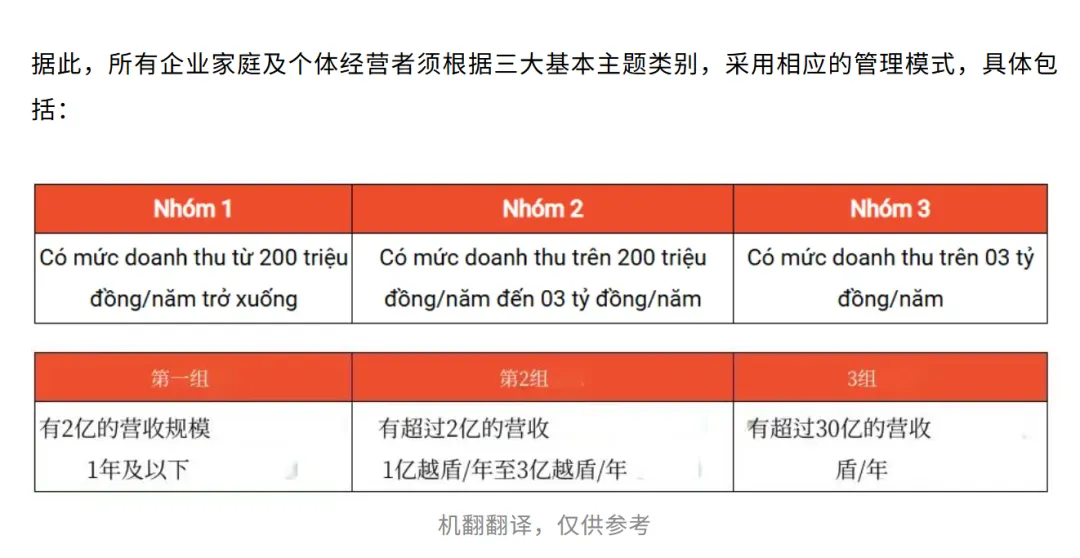 这里要特别澄清一个误传:此前有消息说第三组营收标准是 "30 亿越南盾",实际以政府文件 "3 亿越南盾" 为准,卖家别因误判规模影响合规。