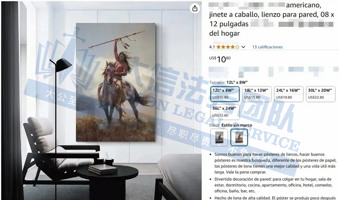 此案为版权维权,涉及2张版权作品,版权号:VA 2-423-747 和 VA 2-423-746 的版权作品,即《The Signal》和《The Ojibwe》,以下是涉及版权的具体信息,未经授权不得擅自使用,侵权风险极高!跨境卖家尽快检索下架,否则会有TRO侵权风险!