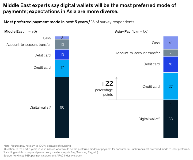 现金外逃不仅体现在数字支付的增长上,还体现在消费者表达的偏好上。在麦肯锡的一项消费者调查中,58% 的中东消费者表示强烈偏爱数字支付方式,而只有 10% 强烈偏爱现金。