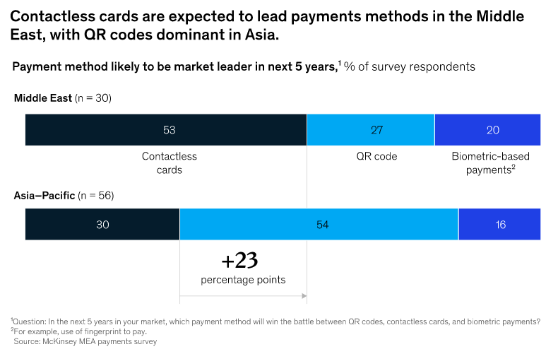 虽然基于账户的钱包在亚洲和一些欧洲国家的渗透率很高,但中东部分地区的卡和基于卡的钱包增长强劲。例如,在沙特阿拉伯,自大流行开始以来,POS 非接触式卡交易每月增长 10%,通过基于直通卡的钱包支付每月增长 18%。3 随着时间的推移,依赖二维码的新兴支付方式可能会占据中东市场的份额,但在必要基础设施发达的国家,随着数字支付的加速,卡的增长可能会继续。