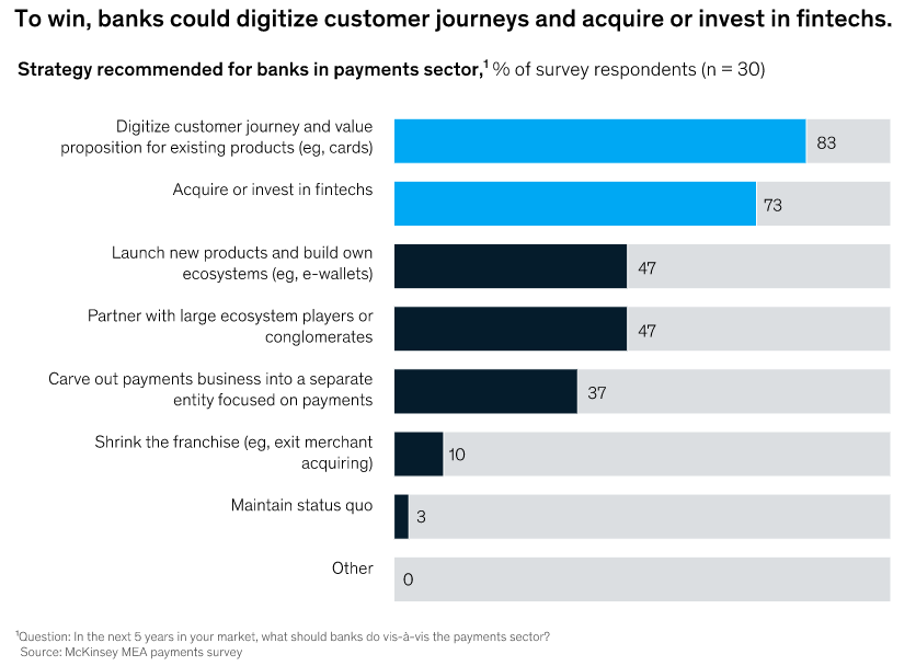 尽管今天银行继续引领行业,但 60% 的受访者预测非银行支付提供商将在未来获胜。83% 的受访者表示,在不断发展的市场中保持相关性的最重要方式是将客户旅程数字化(图 5)。紧随其后的是 73% 的受访者是收购或投资金融科技公司。银行可以考虑的其他行动包括推出电子钱包等新产品和建立生态系统(47% 的受访者推荐)、与大型生态系统参与者或企业集团(也有 47%)合作,以及开拓支付业务以形成独立的可以像金融科技公司一样运作并更灵活地竞争的实体 (37%)。