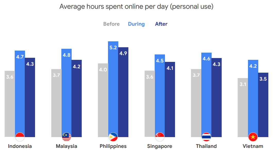 疫情封锁期间,东南亚互联网用户每人每天的平均上网时长从3.7小时增长至4.7小时,其中菲律宾以5.2小时的平均上网时长位居榜首。解封后,东南亚互联网用户的平均上网时长为4.2小时,也比疫情之前的上网时间要长。
