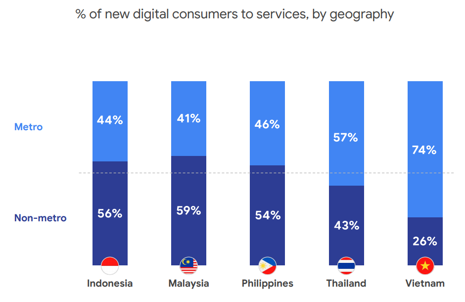 除了越南和泰国,大部分新增互联网用户来自非大都市地区,如马来西亚和印尼分别有59%和56%的新增互联网用户来自非大都市地区。这也意味着下沉市场进一步参与东南亚的数字化进程。