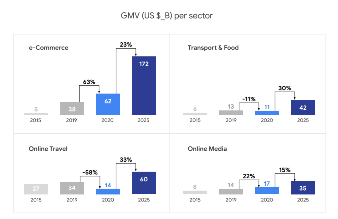 同时,报告还指出,电商、出行&外卖、在线旅游、线上娱乐、金融服务是东南亚数字经济的5大行业支柱。受疫情影响,健康科技和线上教育也迎来了加速式发展。其中,上文所说的4000万新增互联网用户主要涌现在线上教育、杂货电商、借贷这三个行业,这也反过来让这三个行业得到了进一步的增长。