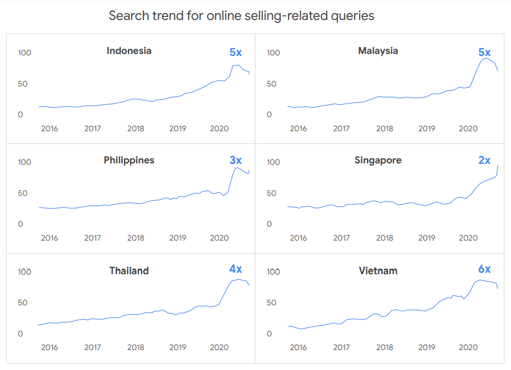 从搜索趋势来看,供应商的线上询盘不断增长。其中,越南供应商的线上询盘迎来6倍增长,印尼和马来西亚迎来5倍增长。