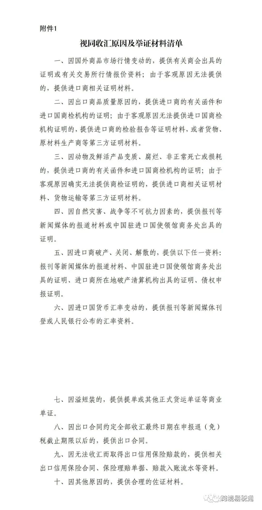 1. 视同收汇原因及举证材料清单