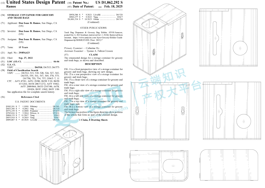 案件核心涉及的美国设计专利为 US D1,062,292S,专利名称为“STORAGE CONTAINER FOR GROCERY AND TRASH BAGS”(用于食品杂货和垃圾袋的储存容器)。该专利于2022年9月27日提交申请,2025年2月18日正式授权。赛贝提醒未经授权,跨境卖家不得销售与该专利设计相同或实质性相似的储存容器产品,否则将构成侵权。