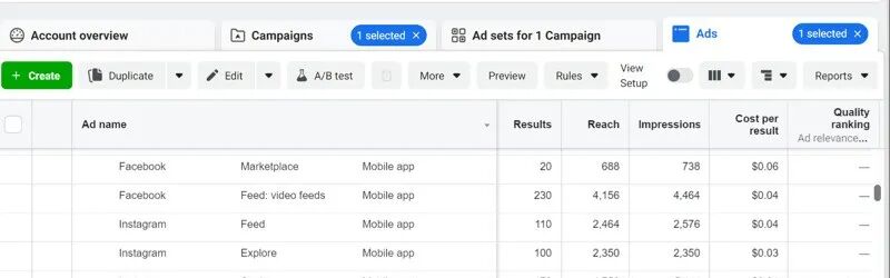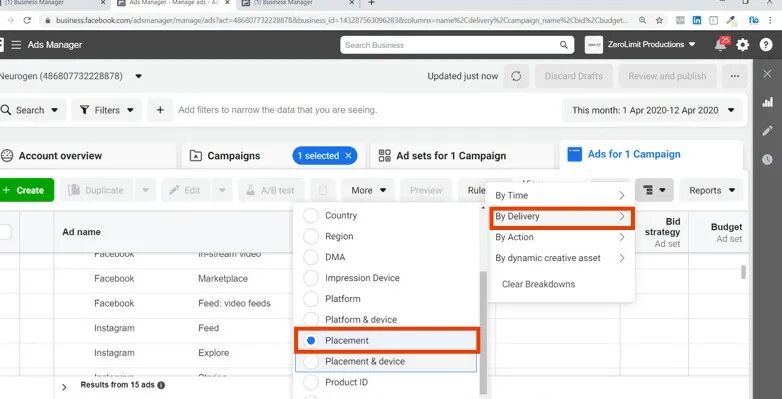 当寻找广告系列中成本达到最低回报的时候,重点去监控Instagram故事和搜索浏览的选项卡。要了解哪些展示位置获得的互动次数最多但互动费用却最低。可以使用Facebook Ads Manager中的细分工具。