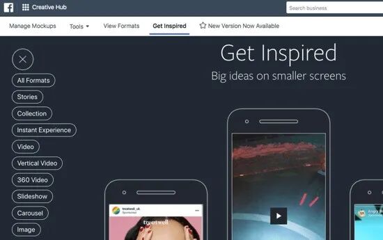 你可以选择创建,预览和测试新的广告组模型,或者浏览查看从不同地方收集到的一些最具创意的广告,这里所显示的所有广告都是为移动端而设计的,体验都非常好,这个标签具有10种不同类型的过滤器,用来查看广告,所有你可以研究最感兴趣的广告类型。