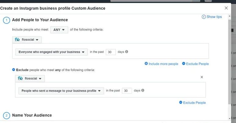 使用“全部”的选项,选择是否只包含满足一个人或者多个条件的人员。你可以选择是否要吸引访问过你的Instagram的业务资料,向他们发送IG上的直接消息,保存Instagram帖子或者广告,或是参与你的IG帖子或者广告的人。