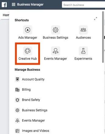 如果你想要找到一些能够通过Instagram认可,但是又不会影响你的广告账户安全的广告灵感,可以怎么办呢!这里推荐一款实用小工具给大家,可以使用Facebook里面的Creative Hub来获得一些帮助。操作上,从业务管理器里面的全局菜单或者广告管理器里面,找到这个选项就可以了。