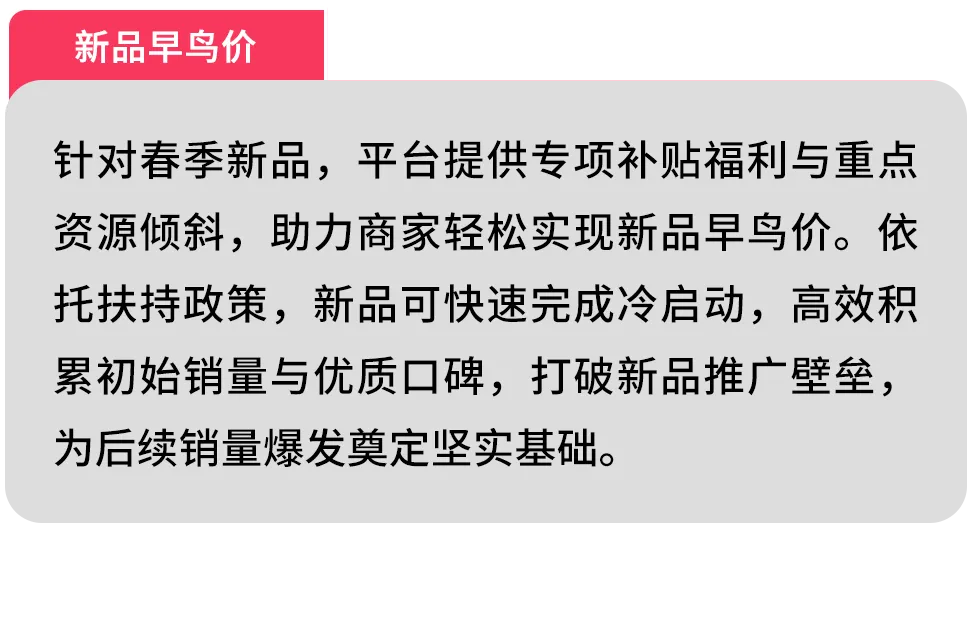 随着春季销售旺季的到来,平台将加大资源投入,推出一系列重磅扶持政策,聚焦春季上新关键窗口期,从新品冷启动、爆发到活动曝光全方位发力,助力商家抢占春季市场红利,推动新品快速打爆、销量稳步攀升。