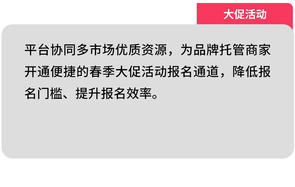• 积极参与,合理让利换销量:建议商家积极报名平台各项活动,通过合理让利,以适度优惠换取更高的曝光,打破销量瓶颈,快速积累客群、提升商品知名度,依托品牌托管的灵活运营优势,实现让利换增长。