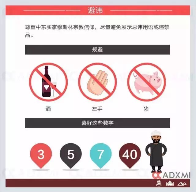 开拓中东市场尤其要注意买家的穆斯林信仰,一些用语和物品要尽量规避,比如酒、左手、猪等字眼要特别敏感。规避的同时,卖家也可以迎合穆斯林的喜好,比如穆斯林喜好3、5、7、40这些数字,卖家就可以在标签或价格上做文章。