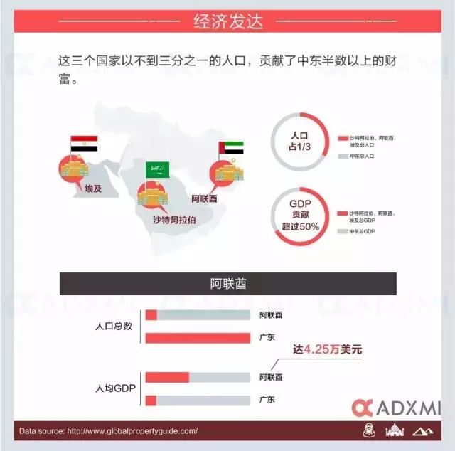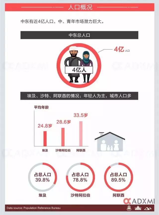 中东地区一共有埃及、伊朗等18个国家,人口总数将近4亿。据全球化移动广告平台Adxmi的数据显示,中东地区的埃及、沙特、阿联酋三个国家的人口、经济指标较为可观,这三个国家常住人口的平均年龄分别为:24.8岁、28.6岁、33.5岁。