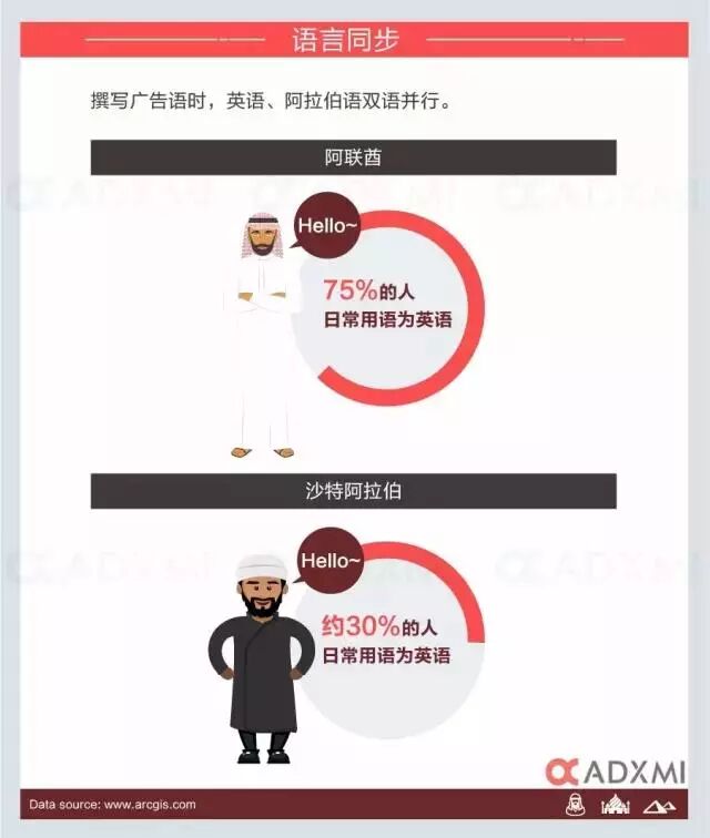 中东地区大部分母语为阿拉伯语,英语普及率地区差异较大。阿联酋有70%的人日常用语为英语,而沙特阿拉伯仅为30%,因此,在投放广告时,就需要英语、阿拉伯语同步推进。