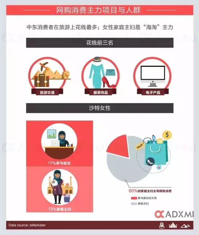 从Adxmi提供的相关数据上进一步细分消费群体,不难看出以中青年为主力的主要消费群体中,女性家庭主妇又是主要消费群体中的“主力”。数据显示,旅游交通、服装饰品、电子产品这三大品类位居消费前三。以沙特为例,仅有17%的女性参加工作,而72%是家庭主妇,而家庭主妇中有60%主导网购消费。