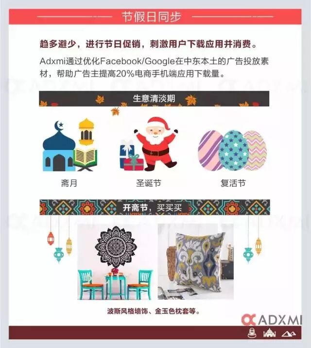 传统的营销策略也应该同步跟进,利用节假日搞促销活动,提升流量,增大曝光面。像斋月、圣诞节、复活节等非穆斯林本土化的节日可能营销效果并不显著,而像开斋节这样的大节日卖家就应该抓准时机,加大投放力度,主推波斯风格的商品。利用人们庆祝节日的消费心理,在广告上也应适时造势,及时引流。