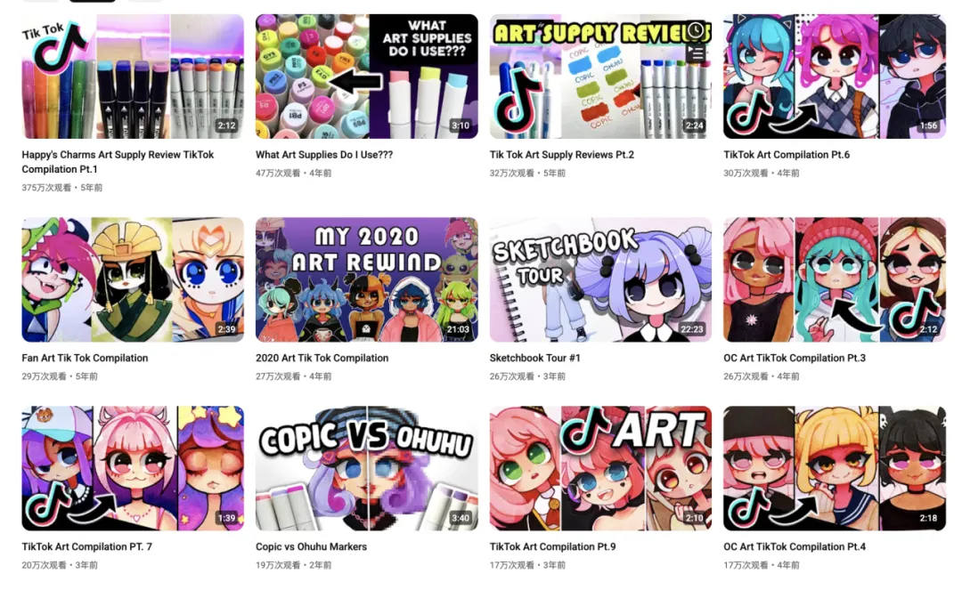 你可以看到从“My Sketching Process”这样的过程分享,到“Head and Face Tutorial”这种基础教程,再到“What art supplies do I use”“Art Supply Tier List”“Copic vs Ohuhu Markers”这种极具决策意义的画材评测。