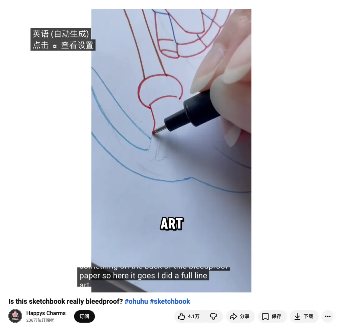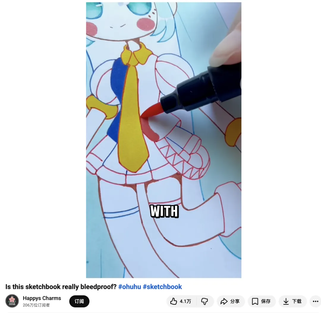 此外,“Is this sketchbook really bleedproof? #ohuhu #sketchbook” 这样针对 Ohuhu 防渗纸本的测试视频,单条就有接近百万的播放量,很多评论直球留言“我需要这本 sketchbook”,而她在简介里附上的购买链接与折扣码 HappysCharmsArt10,更是把这波兴趣顺势转成了实打实的购买行为。