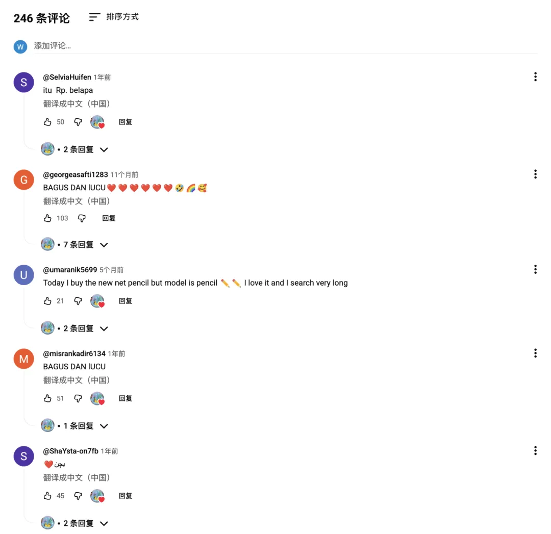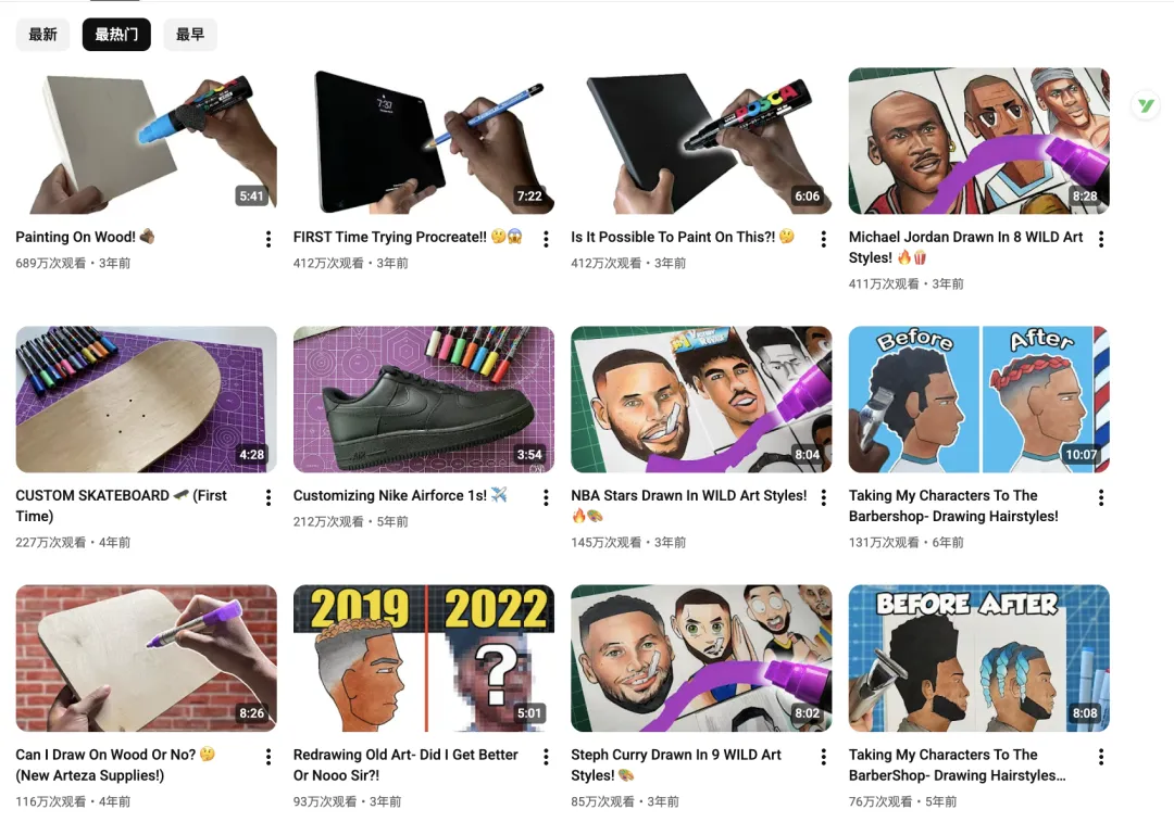 他擅长使用醒目的缩略图、分屏展示、特写镜头以及 “Before / After” 的故事线,整个频道非常符合 13–35 岁年轻人的观看习惯,他的评论区里常出现“你用的是什么笔?”“请做教程”“在哪里买到工具?”等典型购买前信号,说明他的内容天然具有较强导购功能。