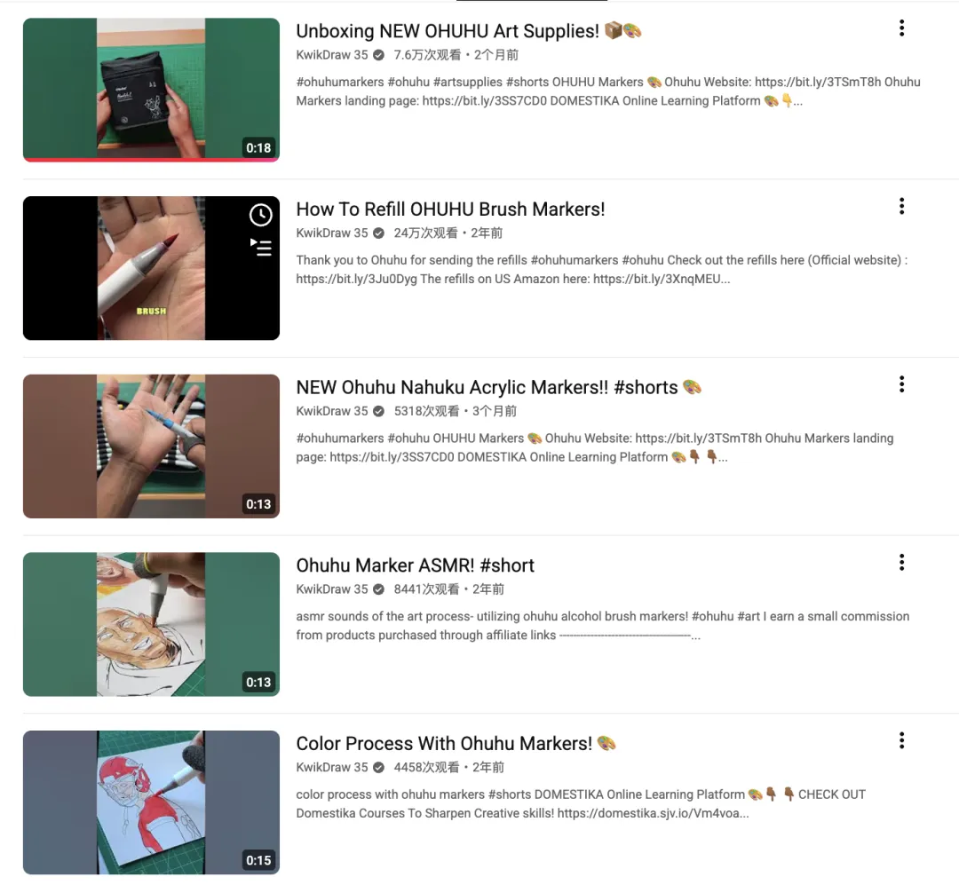 在此基础上,她又陆续发布了“How I refill my Ohuhu Markers!” 等内容,单条视频播放量约 138 万,把“可补充墨水”“长期使用成本更低”等信息自然地塞进日常内容里。