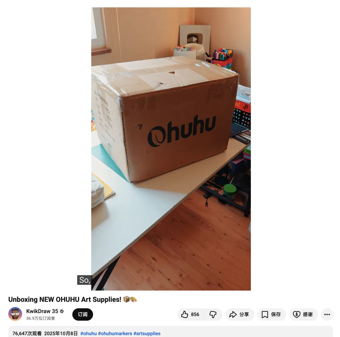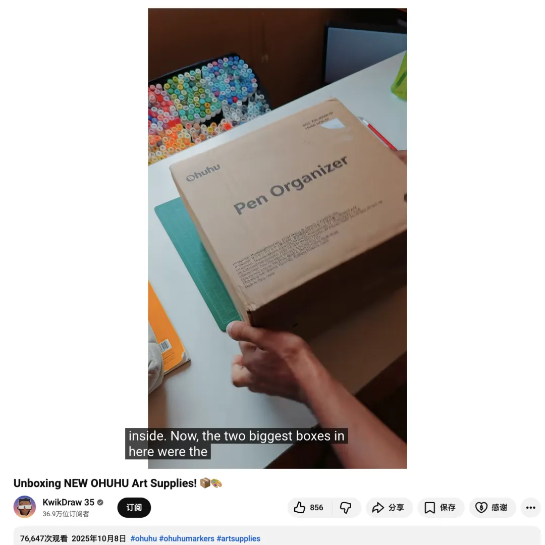 与 Ohuhu 的合作中,这种导购能力被最大化放大。例如那条“Unboxing NEW OHUHU Art Supplies!” 的短视频播放量达到约 7.6万次次以及856 个点赞,并引发大量观众留言询问产品来源与价格。