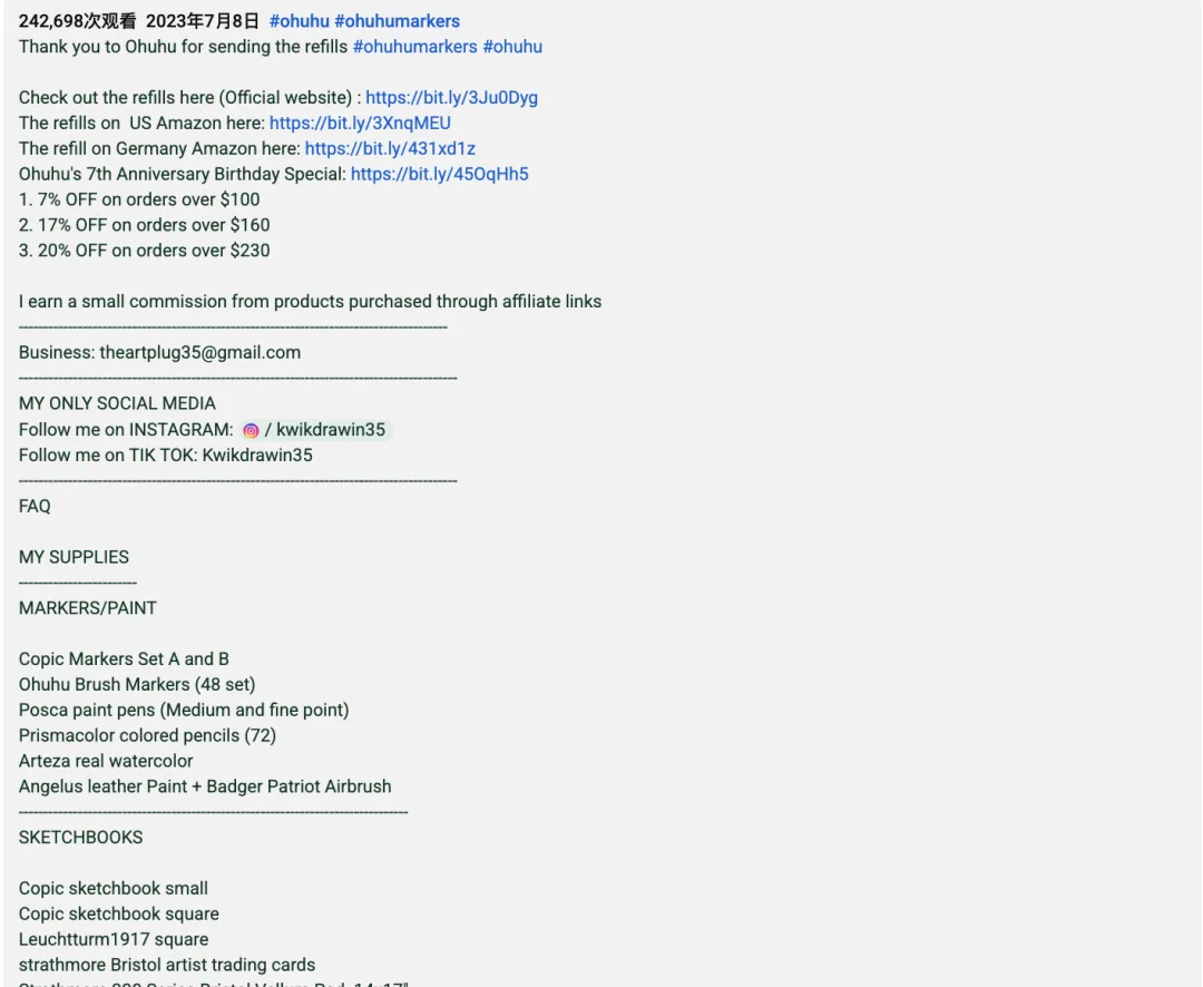 评论区同样提供了合作效果的直接证据。许多用户留言“Why won’t they send me art supplies?”“Do you sell your art?”“I need these markers”,显示赠品开箱具有极强刺激作用;而页面中 Ohuhu 的落地页链接、affiliate 标注与折扣信息,则进一步促成购买路径的闭环。