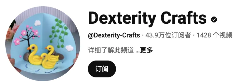 Dexterity Crafts 的个人背景相对低调,更像一个成熟的内容工作室或品牌化创作者。频道目前已获得认证,拥有约 43.9 万订阅者。